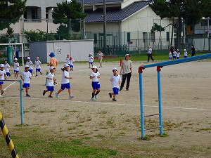 「白小ランRUNラン」に向けて、持久走の練習が始まりました。自分のめあての距離を走ります。1年生では、教師が先導しながら呼吸のリズムや走るペースを考えながら練習に取り組んでいます。