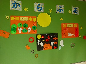 学校の掲示板に、ハロウィンの飾りがたくさんあります。ジャックオーランタンやコウモリなど、10月らしい掲示板です。