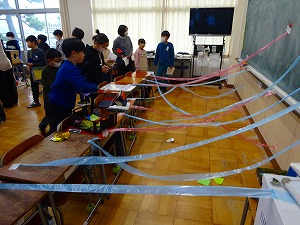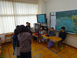 児童会祭りの本番が行われました。3年生以上の各学級が楽しいイベントを企画した出店を準備し、全校が各学級のブースを回りました。6年生のお店では、ツアーガイドがついてクイズに答えながら最後には素敵なダンスを見られるという楽しい企画のお店でした。見ている方もやっている方も笑顔になる素敵なお店でした。頑張って踊ってくれている6年生に自然と大きな拍手が沸き起こりました。出店で定番の入っている中身を当てるブラックボックスや魚釣りゲーム、射的などもあって、小さい子から先生方まで楽しめるお店がたくさんでした。クラスで協力して一つのことをやり遂げるよい機会となりました。