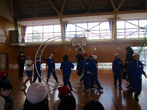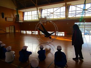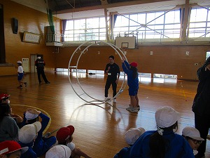 ラートとはドイツ発祥のスポーツで、直径が身長より大きい2本の鉄の輪を平行につないだ器具を使って行います。当校には、全日本ラート競技大会に出場している教員がいて、今日は子どもたちにラート競技を披露してくれました。素晴らしい技の数々に子どもたちの歓声が沸きました。