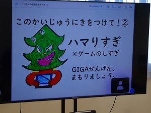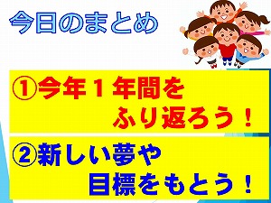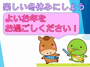 冬休み前の全校朝会が行われました。インフルエンザ流行期のためオンラインでの実施でした。書道やバスケットボール等の表彰が行われ、校長先生のお話や冬休みのきまりなどのお話がありました。明日から18日間の冬休みに入ります。楽しい冬休みになるように安全に気を付けて過ごしていきましょう。