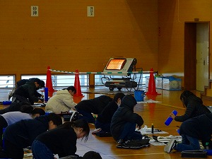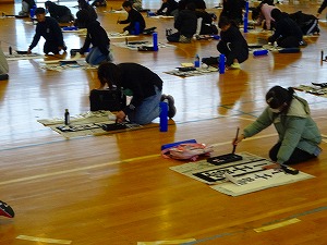 5年生が新年の書初めを体育館にて学年一斉に行いました。冬休みに練習してきた成果を発揮し、「富士山」の文字をお手本をよく見ながら書きました。一画一画を丁寧に書きました。体育館に響き渡る琴の調べ(春の海)の中、新年にぴったりの学習となりました。