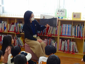3年生の図書館の時間の風景です。図書館司書による絵本の読み聞かせが行われました。鬼の出てくる季節に合った内容のお話でした。登場人物の女の子に振り回される鬼の様子がコミカルに表現され、子どもたちもお話の中に引き込まれていました。