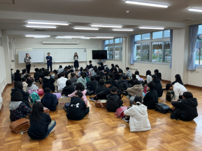 先生たちは、趣味や好きなことなどをまじえて自己紹介です。お話の後は、またまた子どもたちの温かい拍手です。
