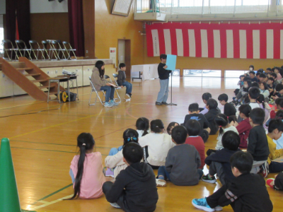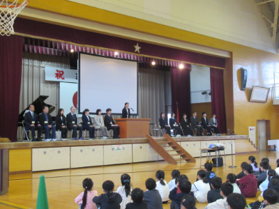 最初に新任式があり、新しく着任した先生たちとご対面です。子どもたちの温かい拍手の中、先生たちの入場です。