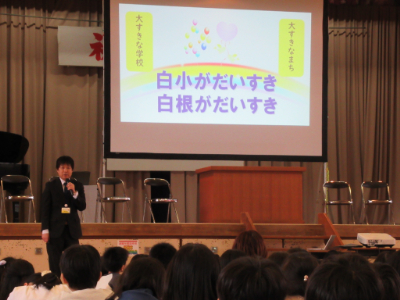 先生たちの自己紹介の後は、児童代表の歓迎のあいさつです。白根小や白根の自慢をお話ししてくれました。