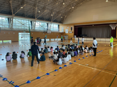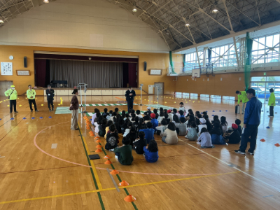 まずは、1・2年生対象の安全な歩き方の学習です。手を挙げるのは、ドライバーに自分の存在を伝えるためです。今日学んだことを明日から生かしてくださいね。
