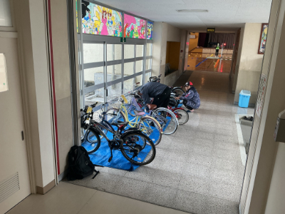 1クラスずつ自転車実習を行い、もう一方の学級は、ビデオで学習です。
