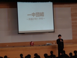 4月20日(月) 生徒朝会 スローガン「一中団結」の下、生徒総会に向けて
