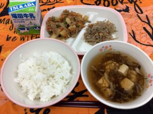 🔶今日の給食🔶 809kcal ごはん、じゃがいものきんぴら アーモンド入りちりめんじゃこの佃煮 もずくスープ、牛乳 佃煮&きんぴらコンビ、今月も登場です。もずくスープもなにげにこのコンビと仲良しで …