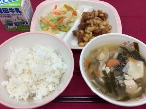 🔶今日の給食🔶 ごはん、即席漬け 大豆と大根のアーモンドがらめ みそワンタンスープ、牛乳 人気のみそワンタンスープは、もやしにナルト、メンマ等が入っていて、みそラーメンの味わいです。