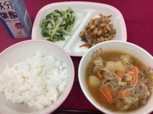 🔶今日の給食🔶 ごはん、ごま入りわかめ和え 鉄火みそ、カレー肉じゃが 飲むヨーグルト このところ、「変わり肉じゃが」がよく提供されます。今日はほんのりカレー味がおいしい肉じゃがです。
