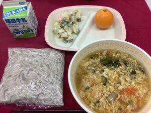 🔶今日の給食🔶 大麦麺、卵とじ汁 ヨーグルト入りさつまいもサラダ みかん、牛乳 今月の麺は、太くて食べ応えある大麦麺です。豚肉やかまぼこ、野菜たっぷりの和風卵とじ汁でいただきます。