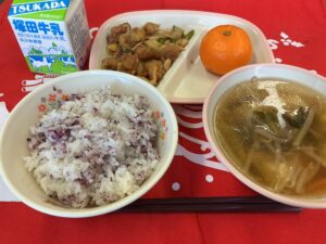 🔶今日の給食🔶 ゆかりごはん、鶏肉とさつまいもの揚げ煮 帆立と青梗菜のスープ、みかん、牛乳 酸味爽やかなゆかりごはんと甘いさつまいもの揚げ煮は絶妙の組み合わせ。 スープの帆立が効いています!