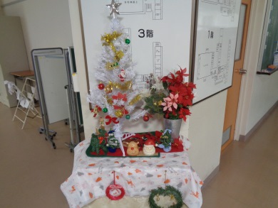 職員・来校者用玄関にはクリスマスツリーとクリスマスの飾りがあります。一中を訪れた人を和ませています。 階段を上がると2階の図書室です。図書室前の廊下もクリスマスの飾りで本が紹介されています。クリス …