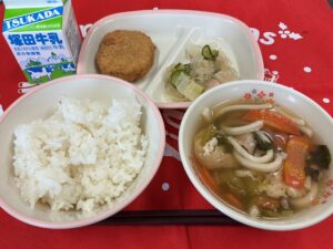 🔶今日の給食🔶 ごはん、かぼちゃコロッケ 白菜の柚子ドレッシングサラダ、うどん汁 牛乳 今日は「冬至献立」です。コロッケにはかぼちゃがたっぷり!サラダのドレッシングの柚子がとっても爽やかです。