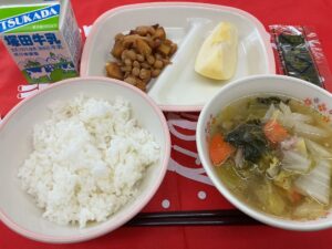 🔶今日の給食🔶 ごはん、味付け海苔 大豆とさつまいものアーモンドがらめ 肉団子と白菜のスープ、りんご、牛乳 冬休み前最後の給食です。白根給食センターの皆さん、おいしくて栄養バランス抜群の給食を …