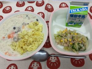 🔶今日の給食🔶 803kcal カレー味ごはん 鶏肉とあさりのクリームソース ツナとコーンのサラダ、牛乳 黄色にカレー味ごはんに白くて甘いクリームソースをたっぷりかけていただきます。 サラダのツナ …