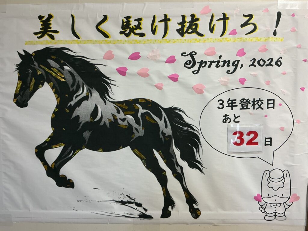 強風は治まりましたが、積雪で校地内は一面白くなりました。積雪が増えないことを願っています。 3階の3年生教室棟への階段を登りきると、大きな掲示物が目に入ります。今年の干支、「馬」の美しいフォルムで …