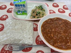 🔶今日の給食🔶 824kcal ソフトめん、チーズ入りミートソース アーモンド入りこまツナサラダ、牛乳 今月の麺献立は給食でおなじみのソフトめん。ミートソースでいただきます。ソフトめんにはミートソース …
