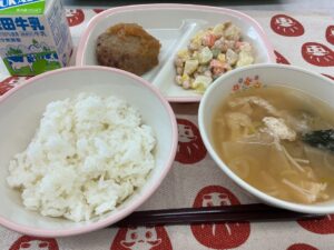 🔶今日の給食🔶 818kcal ごはん、ハンバーグの玉葱りんごソース コロコロビーンズサラダ 大根と油揚げのみそ汁、牛乳 今日のハンバーグには玉葱とりんごの甘いソースをかけていただきます。 サラダ …