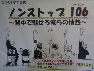 新たな積雪はなく、降雪は一段落した様子です。授業が始まると青空が広がり、太陽の光がまぶしく感じます。 今週で1月が終わり、来週から2月になります。3階の3年生教室等に向かう階段を上ると、大きな掲示 …