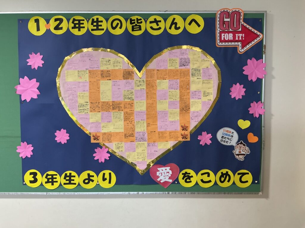 1・2年生の想いに応えるように、生徒玄関の掲示板に3年生一人一人から1・2年生に向けたメッセージが掲示されました。後輩を大切にした3年生の心優しいメッセージです。 50周年の今年度を共に過ごした3つの …