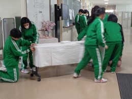 今日の午後、1・2年生は明日の卒業式の準備を行いました。2年生は式場となる体育館、1年生は玄関や廊下、3年生教室や来賓控室の準備をしました。椅子を運び並べたり、紅白幕を張った利する2年生。隅々まで丁 …