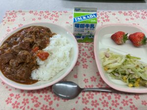 🔶今日の給食🔶 835kcal ごはん、粉チーズ入りハヤシライス ハムサラダ、いちご、牛乳 今日は「食育の日」。白根給食センターのみなさんが1年間ありがとうの気持ちを込めて、ハヤシライスに💛形のニンジン …