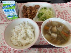 🔶今日の給食🔶 ごはん、鶏肉と大豆のごまがらめ 塩もみ、春野菜汁、牛乳 給食の食材から季節を感じることができます。今日のみそ汁は春野菜がいっぱいです。