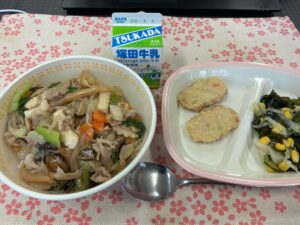🔶今日の給食🔶 ごはん、中華丼の具、豆腐野菜ナゲット わかめサラダ、牛乳 野菜や豚肉、魚介などたっぷり入った具沢山の餡をごはんにかけて、中華丼でいただきます。