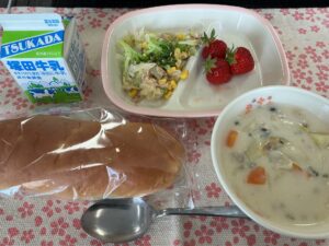 🔶今日の給食🔶 アップルパン ツナとブロッコリーのサラダ クラムチャウダー、いちご、牛乳 今月のパンは甘いりんごチップがいっぱいのアップルパンです。濃厚なクラムチャウダーがパン、サラダによく合 …