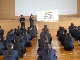 曇り空の火曜日です。今日の朝は1学年朝会でした。今日も8時20分の活動開始時刻前に整列完了です。 今回は学年委員会がスローガンを発表しました。事前に1学年全員に「どんな学年になりたいか、どんな学年 …