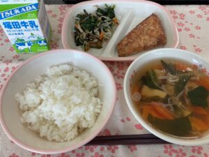 🔶今日の給食🔶 ごはん、鯖の竜田揚げ、のり酢和え 五目汁、牛乳 人気食材の鯖が今月は竜田揚げで登場です。しっかり下味がついてごはんにとっても合います。