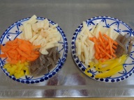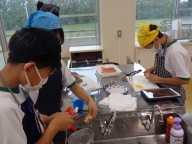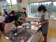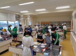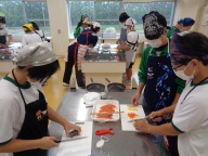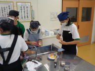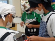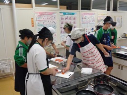 にんじんやレンコンの皮をむいたり、それらの食材を同じくらいの長さに切りそろえたりととなかなかたいへんです。最初は苦労しながら、でも次第に楽しそうに調理実習は進んでいきました。どのグループも役割分担をしっかりとして、チームワークよく作りました。