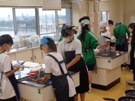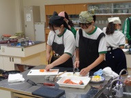 今日の3・4時間目は1年2組は家庭科の授業でした。今日は調理実習です。作る献立は「鮭のホイル焼き」です。生鮭を付け合わせのにんじんやレンコン、こんにゃくなどをいっしょにアルミホイルに包んで焼きます。先生の話をよく聞いて、手順やポイントを確認して、さあ挑戦!