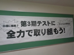 生徒玄関に青いのぼり旗が立ちました。玄関を入ったところの大きな掲示板にポスターが張られました。定期テストが近いことを知らせています。3連休明けの11月4日(火)・5日(水)の2日間、今年度3回目の定期テスト、3期テストを実施します。