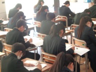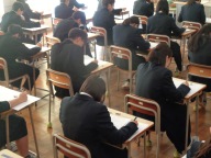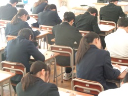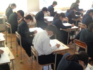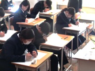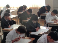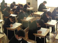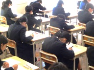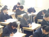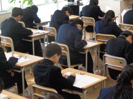 今日は今年度3回目の定期テスト、「3期テスト」の1日目です。最初の教科のテストが始まりました。集中して解答し、筆記用具を走らせています。