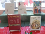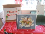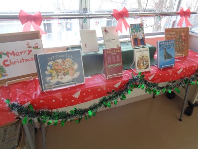 階段を上がると2階の図書室です。図書室前の廊下もクリスマスの飾りで本が紹介されています。クリスマスに関する本です。