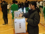 演説会後、選挙管理委員会の運営で選挙を行いました。間違いなく、正しい投票ができるようにとスクリーンを使ってわかりやすく説明しました。公職選挙で使用する記載台、投票箱をお借りして、公職選挙と同じように投票しました。