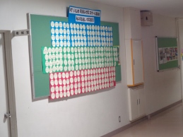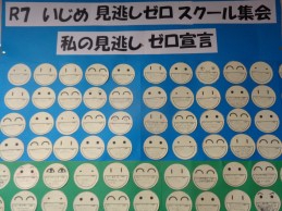 生徒玄関の掲示板に大きな掲示物が見られます。「私の見逃しゼロ宣言」です。11月20日に生徒会本部が中心となり、小学6年生を招いて「いじめ見逃しゼロスクール集会」を行いました。どうすればいじめを防げるか、何ができるかを小グループで話し合い、想いを共有しました。集会を振り返り、生徒一人一人が「自分はどうするか」を考え、「こうする」を言葉に表したものが「私の見逃しゼロ宣言」です。学年カラーごとに分けて掲示され、全校生徒の宣言を確認できます。