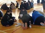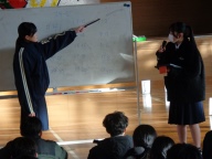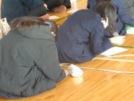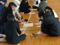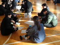 各クラスの出席番号順に編成した小グループで、集会当日の劇のある場面を思い出し、どうすればよかったか、どうすることができたかを個人で考え、グループで協議し、学年全体で共有しました。