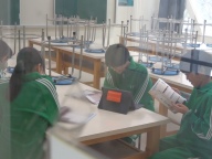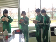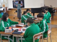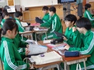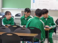前時に「魔王」の今日を聞いた生徒たち。今日は日本語訳された歌詞に注目し、どのような登場人物がいて、どういう状況なのかを確認しました。語り手、父親、こども、魔王の4人について、グループで役割を決め、日本語歌詞の朗読に挑戦しました。人物像や状況を考え、どのように工夫したらよりよく伝わる朗読になるか、みんなで考えました。その後、各グループごとに空いている教室に分かれて朗読を練習、最後はタブレット端末に録音し、データを送信しました。どのグループがどんな朗読になったか、楽しみです。振り返りでは表現のポイント「声の高さ」「声の大きさ」「声の調子」の3つが生徒から出てきました。