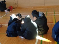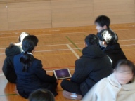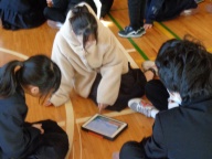 今朝は1学年朝会でした。学年委員会が「『冬休みの過ごし方』をみんなで確認するため、理解しやすいようクイズにしました!」とクイズ大会が始まりです。冬休みのきまりややるべきこと、注意することの他にも、クリスマスやお正月などにもちなんだ問題が出題されました。クイズはすべて4択です。解答するのはクラスの生活班のグループ。教室と同じ並びで輪になり、タブレット端末で解答します。