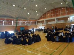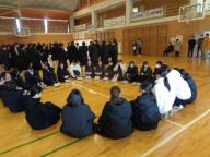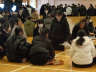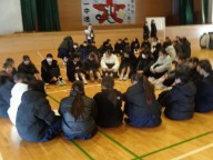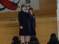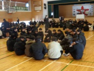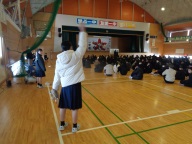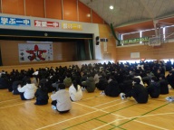 今朝は生徒朝会でした。全校生徒が暖かい身支度で体育館に集合です。