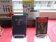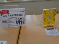 一つは「先生おすすめの本」の紹介です。一中の先生、事務職員、司書、用務員、特別支援教育支援員、地域教育コーディネーターみんなが「おすすめの本」を紹介しています。一中図書室の蔵書は本そのものを展示、貸し出し中や取り寄せ中の本は届き次第展示します。その教職員らしい選書もあれば、意外な選書で驚くこともあります。
