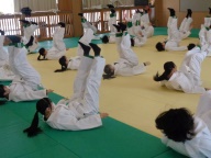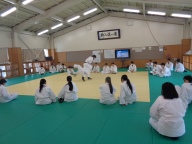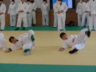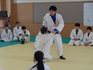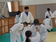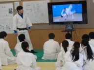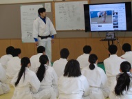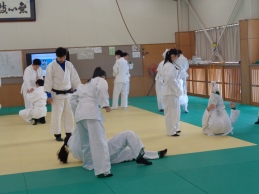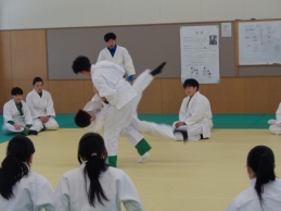 各学年、今は柔道を学んでいます。3年2組は前時に「支えつり込み足」を学び、練習しました。今日は「体落とし」を覚えます。寒い武道場です。入念にウォーミングアップ、ストレッチで体を温め、ほぐします。安全のため、基本となる大切な受け身は繰り返し繰り返し練習します。パーン!という畳をたたく音が響きます。音はそろっていて一つに聞こえます。みんな、とっても真剣です。支えつり込み足を復習した後、いよいよ体落としに挑戦です。ペアやまわりの仲間で教えあったり、先生がアドバイスを送ったり、どんどん形になってきます。正しい体さばきによる崩しが効果的であることを実感できた授業でした。