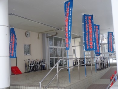 生徒玄関に青いのぼり旗が立ちました。定期テストが間近であることを示す合図です。今年度4回目ののぼり旗は4期テストが近い証です。生徒玄関内側のピロティには大きな掲示板に「全力で取り組もう」と生徒に呼びかける特大ポスターが掲示されました。