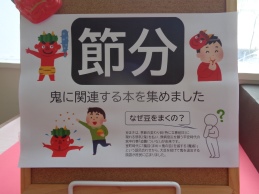 2月3日の今日は「節分」。一中で豆まきはしませんが、図書室廊下の展示コーナーには「鬼」に関する本が紹介されています。職員・来航車用玄関の飾りも赤鬼・青鬼が並んでいます。