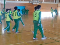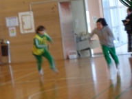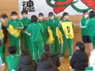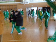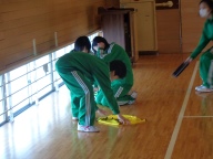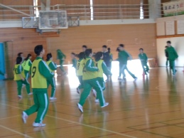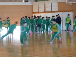 今日は1学年朝会です。4期テストをみんなでがんばった、今日はその分思い切り楽しもう、と学年レクリエーションを行いました。体育館いっぱいを使っての「助け鬼」という鬼ごっこです。「鬼をやってくれる人はいませんか?」の学年委員の呼びかけに次々と名乗り出る生徒がいます。とっても積極的です。3分間✖2セットの助け鬼でしたが、みんな本当に一生懸命です。全力で追いかけ、全力で逃げ回ります。終わった後は大きな息をつきながら、その場に座り込んでいました。